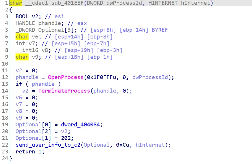 C2 서버로부터 받은 데이터중 new_[2] 에 담기는 값은 특정 프로세스의 ID 값으로 추정된다. 해당 프로세스를 종료시키는 로직인데 아마도 보안 프로그램 등을 종료 시키는 등의 행동을 생각해볼 수 있다. 또한 Optional[]에 특정 정보를 담아서 C2 서버로 전송한다