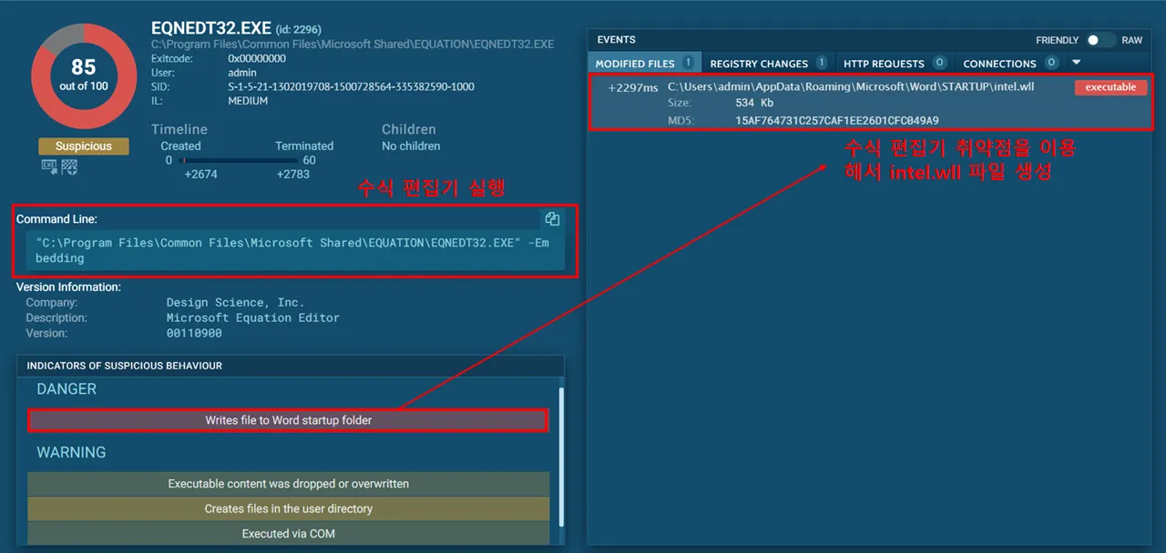 EQNED32.EXE 프로세스의 상세 정보를 확인해보자. 해당 프로세스는 " EQNED32.EXE -Embedding " 명령어로 실행된걸 알 수 있는데, 이는 정상적인 수식 편집기 기능을 하는 프로세스이지만 내부에 존재하는 취약점을 이용하여 startup folder에 특정 파일을 생성한다는 것을 알 수 있다.
