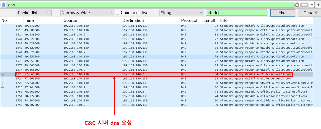 fakenet에서 저장된 패킷을 확인해보면 샌드박스에서 확인한 dns 쿼리 요청와 http reuqest(사진에는 없음)을 볼 수 있다. 현재 해당 서버는 죽어있기 때문에 실제 어떠한 정보를 요청했는지는 정확히 알 수 없다.