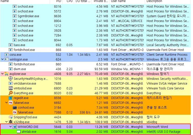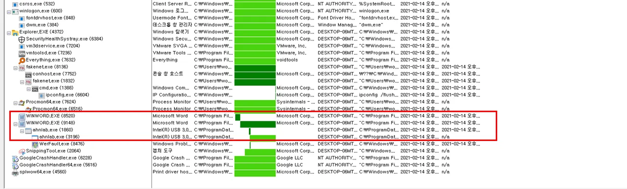 밑에쪽을 보면 실행시킨 문서인 WINWORD.EXE 두 개의 프로세스를 확인할 수 있다. 두 번째로 실행시킨 WINWORD.EXE 하위에 ahnlab.exe 프로세스가 생성되어있는 걸 볼 수 있다.