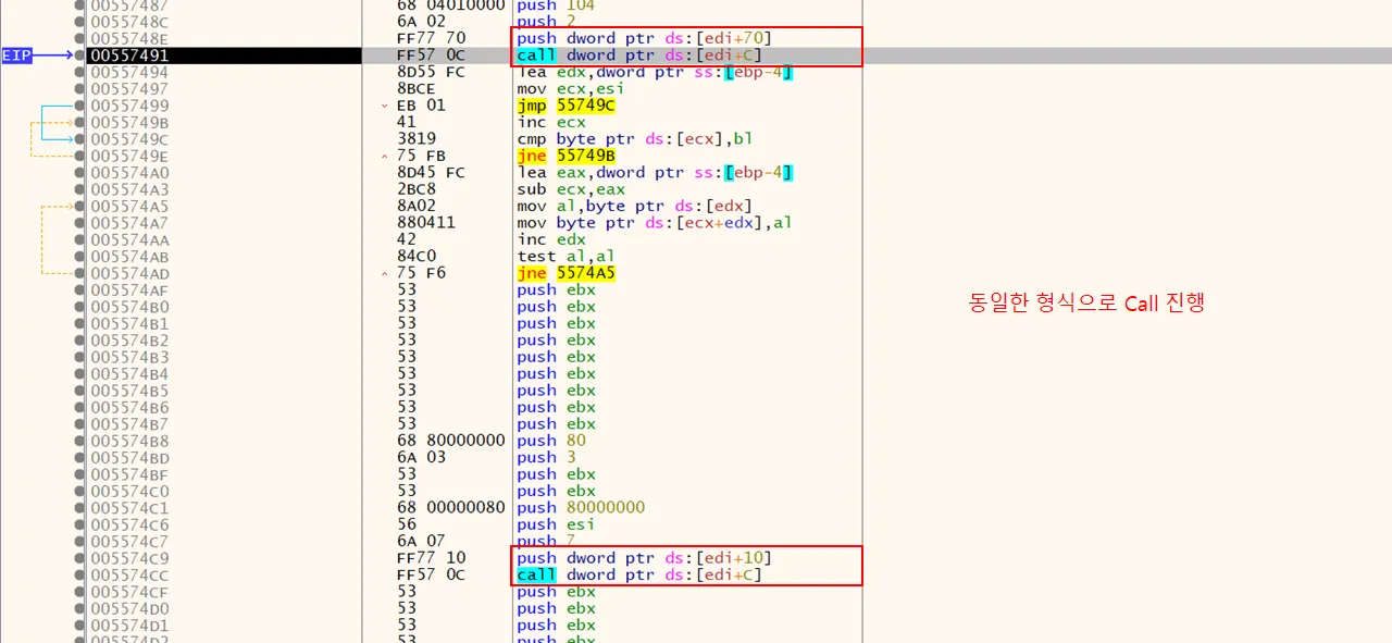 Call [edi+0xC] 형태로 호출을 하는데, 이는 안티 바이러스를 위한 기능으로 어느 함수가 호출되는지는 실제 저 내부를 확인하면서 분석해야한다.