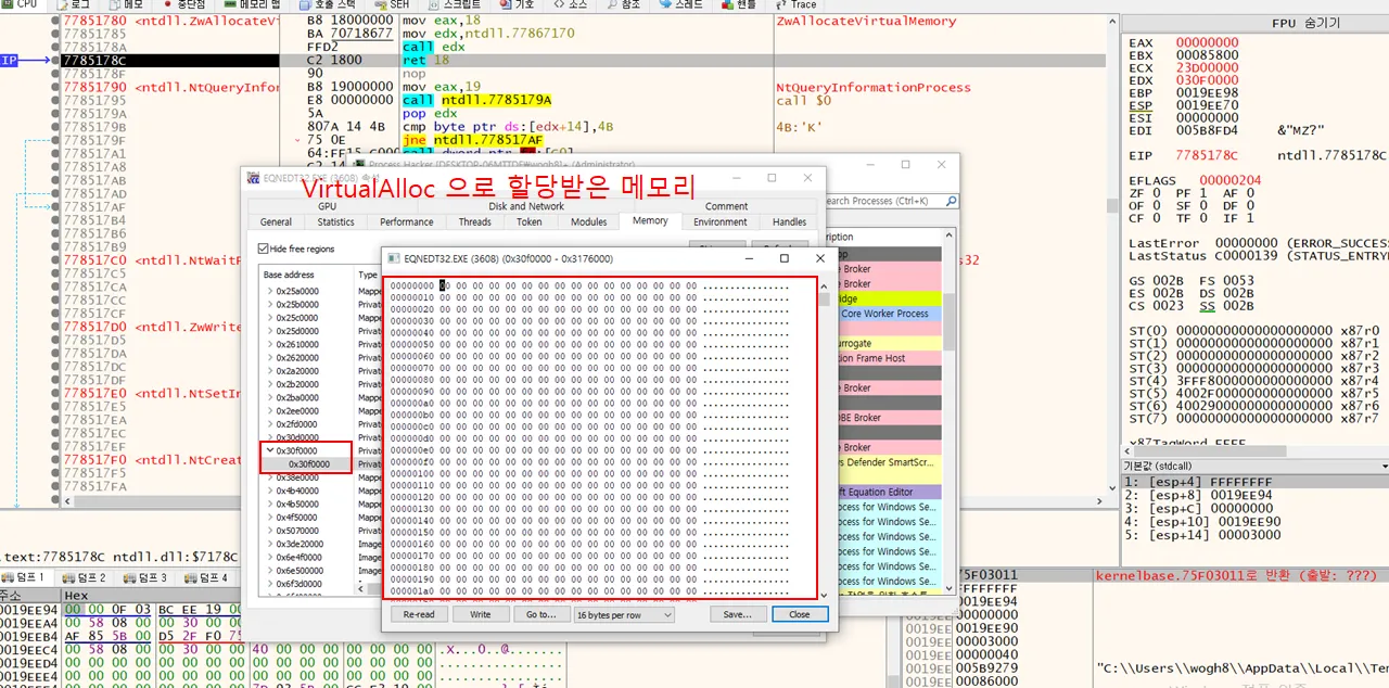 VirtualAlloc 부분은 확인해보면 실제 0x30f0000 영역을 할당받는다. readfile이 진행되면 8.t 의 내용을 저기에 복사할 것이다