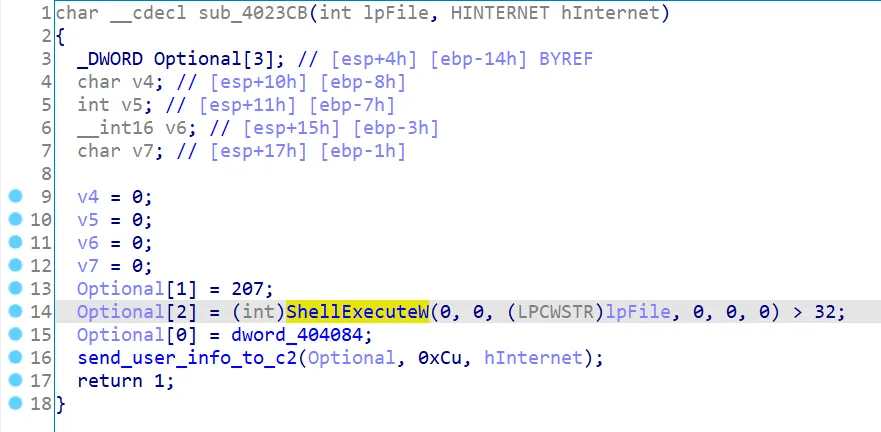 lpFile 에는 C2서버로 받은 데이터가 담겨있는데 이 값이 만약 URL이면 ShellExecuteW 함수는 해당 URL로 접속 시도를 한다. 만약 특정 파일이면 open or 탐색의 수행을 한다. 결론적으로 해당 case에서는 특정 프로그램 수행을 할 것이다.(파일 open이든 url 접속이든, 탐색 등)