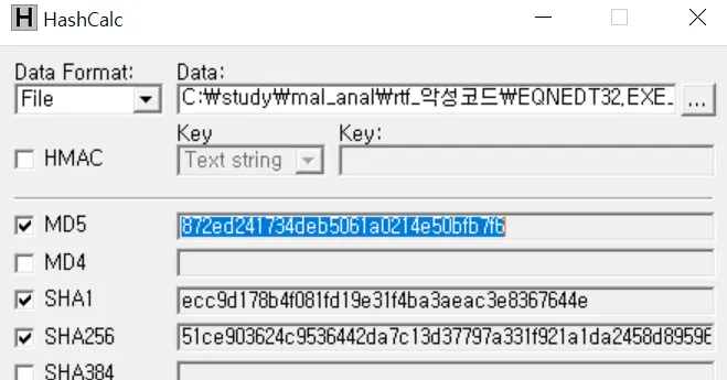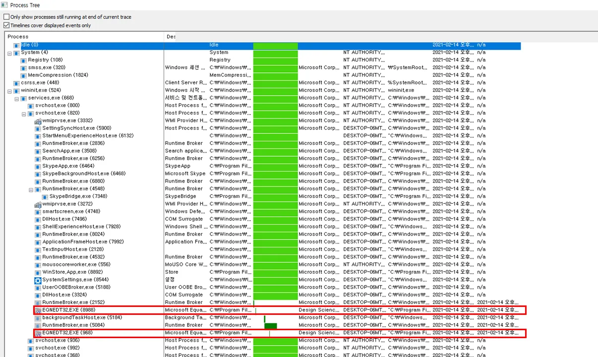 프로세스 정보를 보면 해당 RTF 악성코드인 WINWORD.exe 가 한번 실행되면서, 수식 편집기 프로세스인 EQNEDT32.EXE 가 실행되었다. 해당 프로세스는 부모-자식 관계로 생성된 프로세스가 아니며 독립적인 프로세스이다.