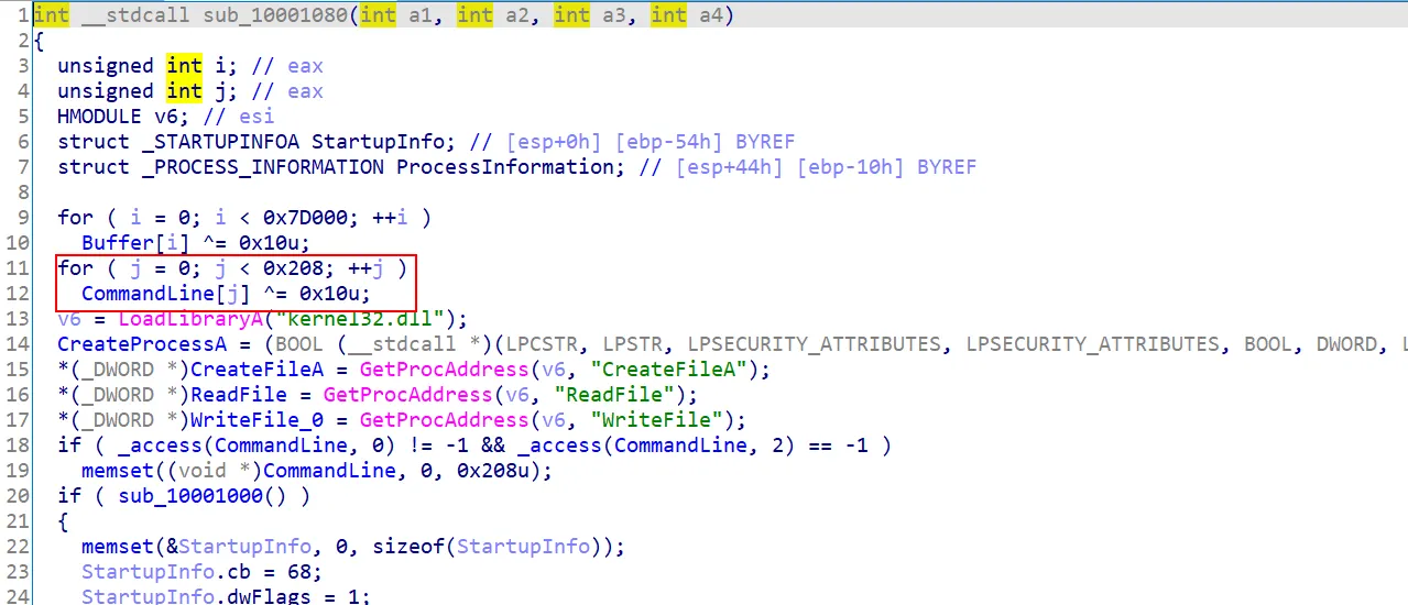 intel.wll dllMain() 을 보면 실제 sub_10001080 함수 내부에서 CommandLine 배열을 xor 연산을 진행한다. 해당 변수는 전역변수로써 복호화 하면 다음과 같은 문자열을 확인 할 수 있다