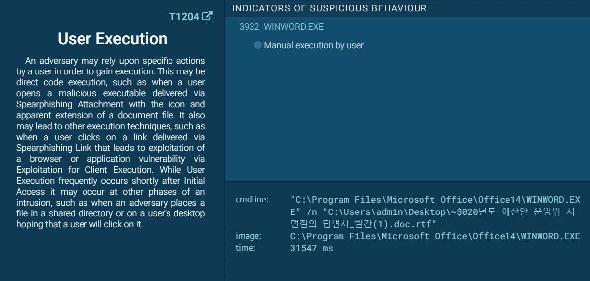 user execution 정보는 직접 실행시킨 RTF 문서파일로 확인된다