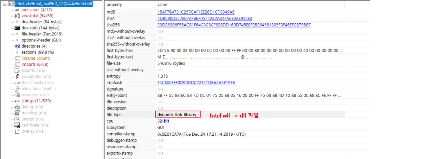 intel.wll 파일을 확인해보면 dll 파일이라는 것을 알 수 있다.