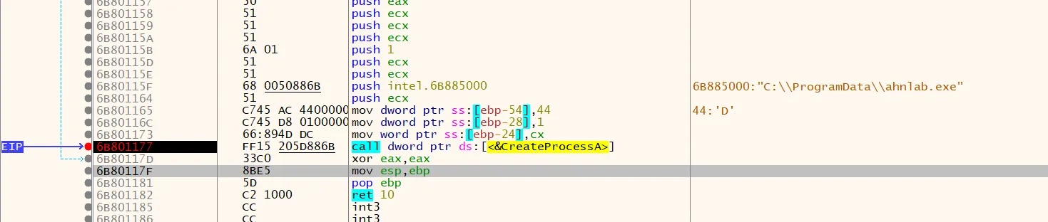 CreateProcessA 함수로 ahnlab.exe를 실행시킨다.