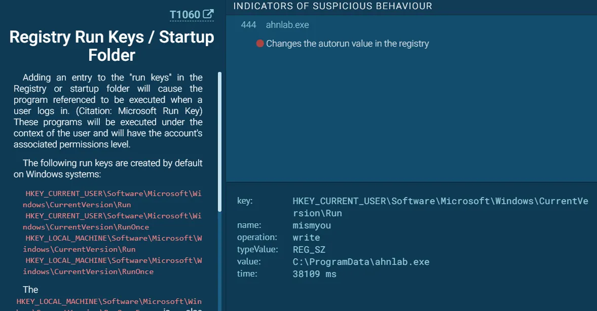 실제 ahnlab.exe 프로세스에서 악성행위가 일어지는 것으로 추정된다. 하지만 샌드박스에서는 어떠한 행위를 하는지 아직은 알 수 없다. 단지 레지스트리에 해당 악성 바이너리를 자동 실행되게 추가한다는 것 정도만 확인할 수 있다.