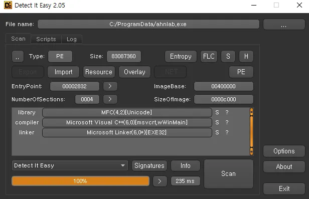 ahnlab.exe 정보를 확인해보면 MFC로 제작된 것을 알 수 있다.