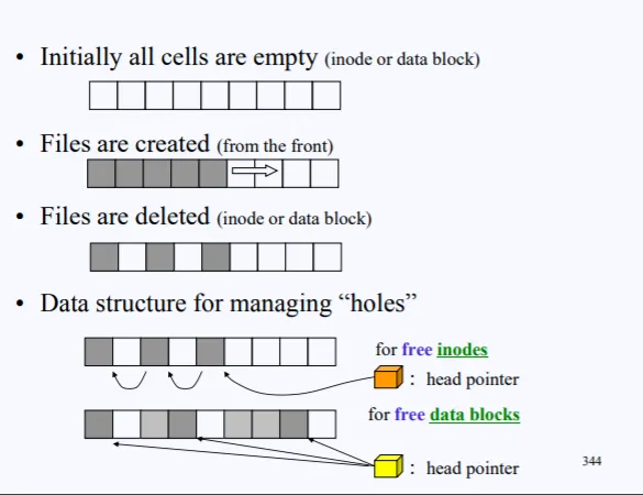 이러한 hole들을 관리하기 위해 free_inodes를 위한 포인터 하나와, free_data_blocks를 위한 포인터가 필요하고 이 정보가 super block에 들어가있다.
