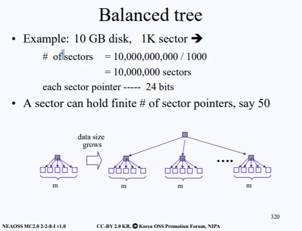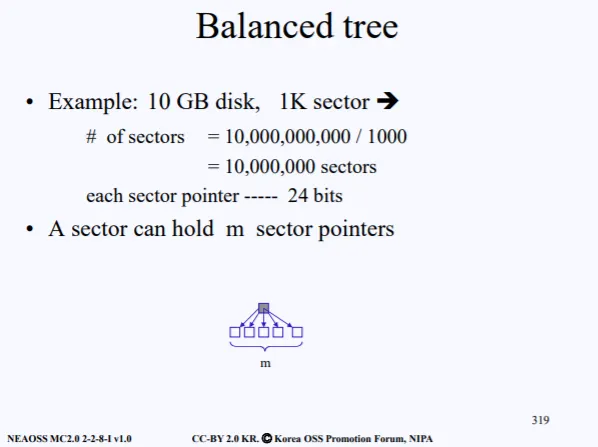 따라서 이러한 Tree는 Balenced Tree(B-Tree) 하고 부른다. 결국 우리는 용량이 큰 데이터를 저장하고, 이를 이용할때는 제일 최상위에 존재하는 하나의 inode만 알고 있으면 된다. 루트 inode를 알면, 여기에 연결되어있는 자식 노드에 접근해서 데이터를 얻어오면 되기 때문이다.
