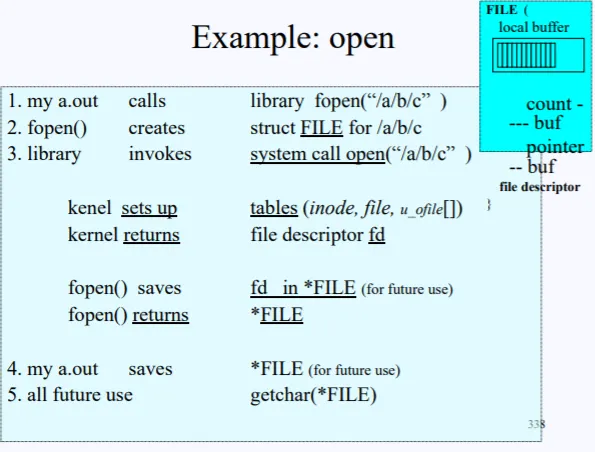 내가 짠 코드에서 FILE* aa=fopen() 이렇게 코드가 수행되면, 실제 라이브러이에 들어있는 fopen이 호출되면서 foepn은 결국 실제 open 시스템 콜을 불르게 될것이다. open이 완료되면, fd가 FILE 구조체의 pointer에 저장이 된다. 따라서 해당 포인터로 fd_table에 접근할수 있고, 유저가 최종적으로 받게되는건 FILE 구조체 포인터의 주소이다.