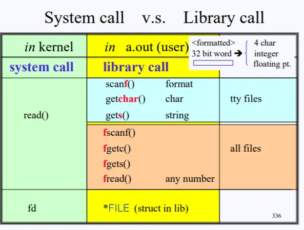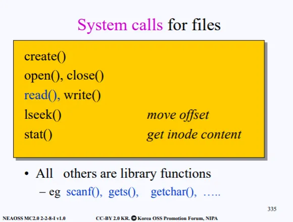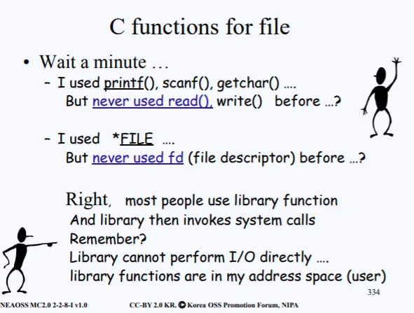 라이브러리 call과 시스템 call의 차이를 한번도 보고가자. 실제 데이터를 읽는 건 시스템 콜에서는 read밖에 없고, 라이브러리에는 아주 많다. 라이브러리 함수들의 공통된 특징은 맨 앞에 f가 안붙어있으면 전부다 표준 입출력에 사용되는 함수이다. (키보드 or 스크린) f가 있으면 전부 파일과 관련된 함수이다.