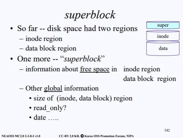 그럼 이러한 inode, data 의 관리가 또 필요하기 때문에 super block 이라는 영역이 존재한다. 결국 디스크에는 superblock, inode, data 여역으로 구분되어져 있다.