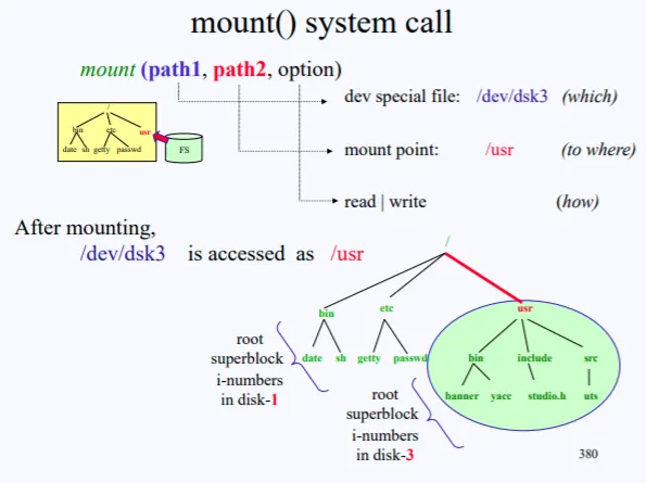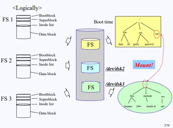 이렇게 현재 disk-1의 FS가 부팅시에 올라와있고, /usr/에 disk-3의 FS를 마운트 시키면 /usr/를 통해 /dev/dsk3의 FS에 접근할수 있다.