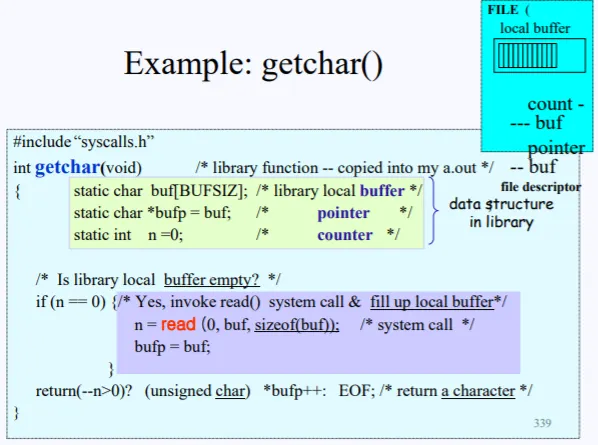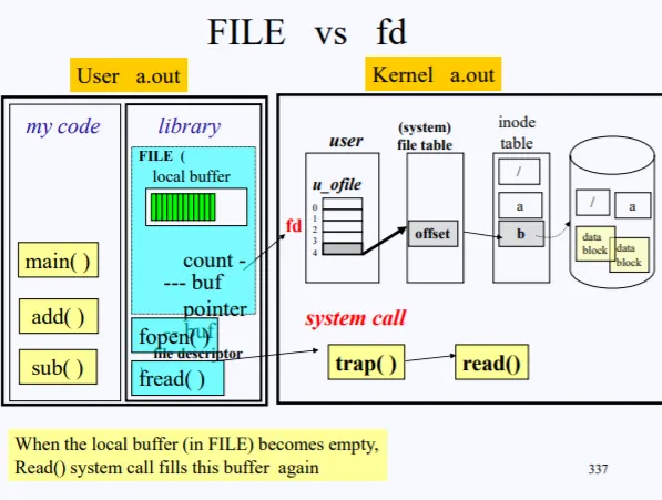 이러한 라이브러리 콜들은 전부 결국 커널에 들어와서 read() 시스템 콜을 호출하게 된다. 이처럼 라이브러리 함수 내에서 FILE* 을 사용하면 결국 커널 내부에서 fd에 관련된 처리가 된다. 좀더 자세히 설명해보면