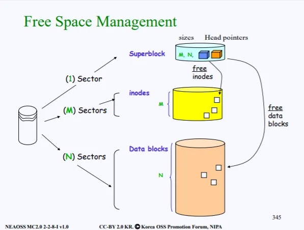 위 그림이 바로 super block에 들어가 있는 free_inodes, fre_datablock 포인터를 나타낸다. M과 N은 각각 indoe와 data block의 사이즈가 들어있다.