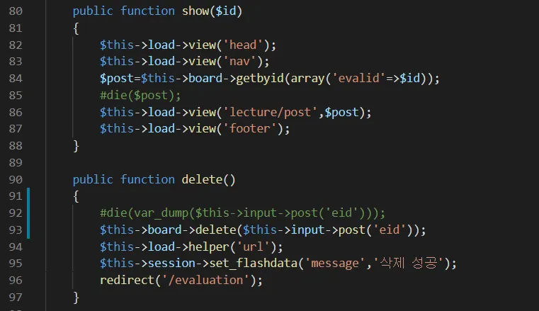 show() 함수는 게시글을 선택했을때 보여지는 기능을 한다. 강의평가 페이지에서 해당 게시글을 선택하면, GET 방식으로 해당 게시글에 대한 id 값이 넘어가게 해놨고, 해당 값을 가지고 board모델의 getbyid() 함수를 호출한다