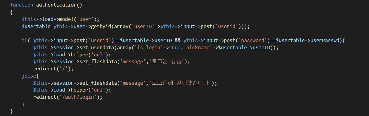 로그인을 검증하는 함수이다. 현재 입력한 id와 passwd를 db에서 확인하여 일치한다면, 세션값을 설정해준다