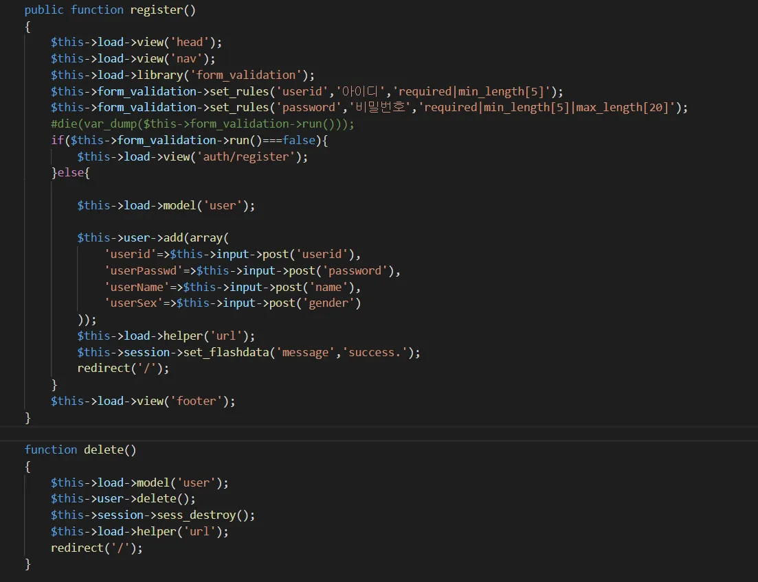 register() 함수는 회원가입을 위한 기능이다. 해당 함수 역시 입력폼 검증을 간단히 한뒤에 user 모델의 add() 함수를 호출하여 db에 저장을 한다.
