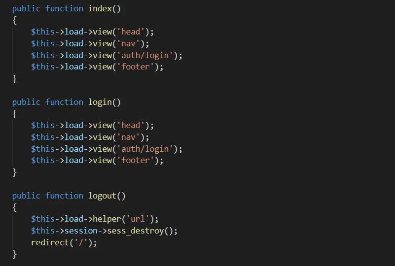 사이트 레이아웃을 head, nav, footer로 나눴다. login() 함수는 auth/login.php 페이지를 로드하게 했다.