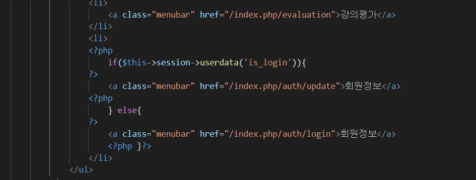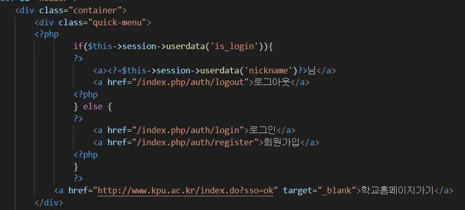 head.php에서 위 코드는 제일 상단에 표시되는 정보가 보여진다. 세션에 로그인이 되어있다면, 사용자 id를 출력해주고, 로그아웃 버튼을 출력한다