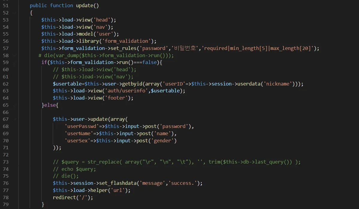 초기에 업데이트 함수가 호출되면 입력폼 결과가 false가 나오므로 현재 로그인된 사용자의 회원정보를 Model에 등록된 getbyid() 함수를 호출하여 얻어온뒤에 auth/userinfo.php 페이지에 뿌려준다
