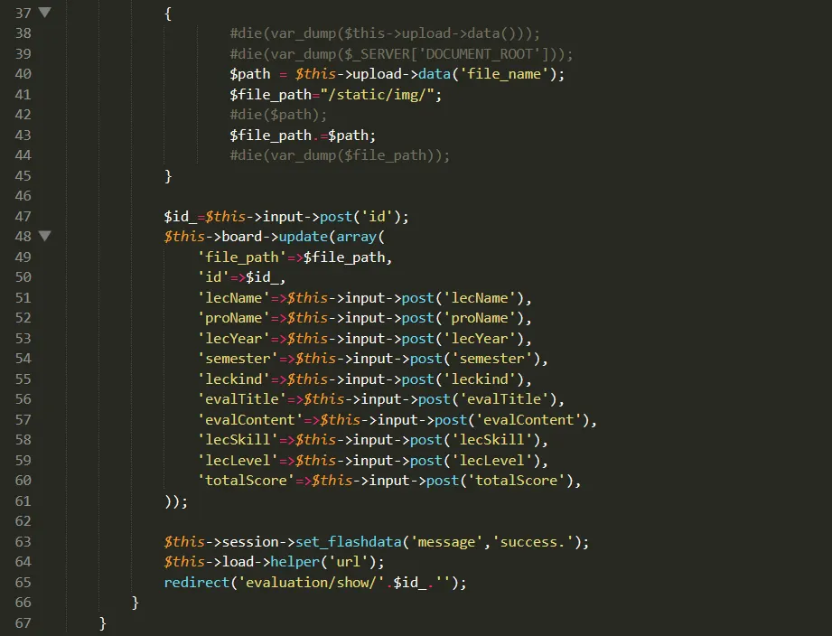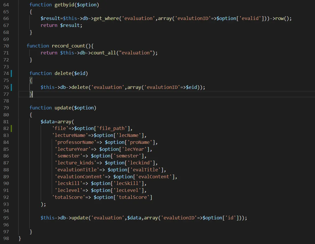 update 함수는 강의평가 게시글을 수정하는 기능이다. 간단한 입력폼 검증을 통해 입력 값을 체크한다.