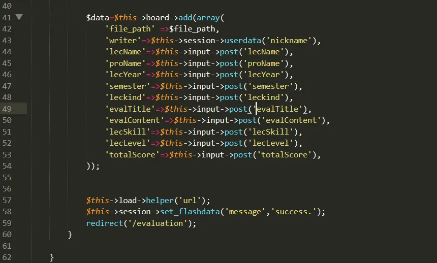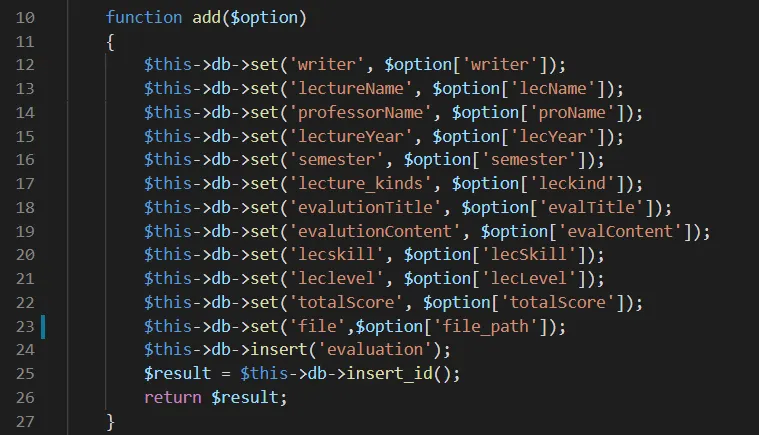 delete() 함수는 강의평가 게시글을 삭제할 수있는 기능이다. post.php 에서 넘어온 post 값을 가지고 delete를 진행한다.