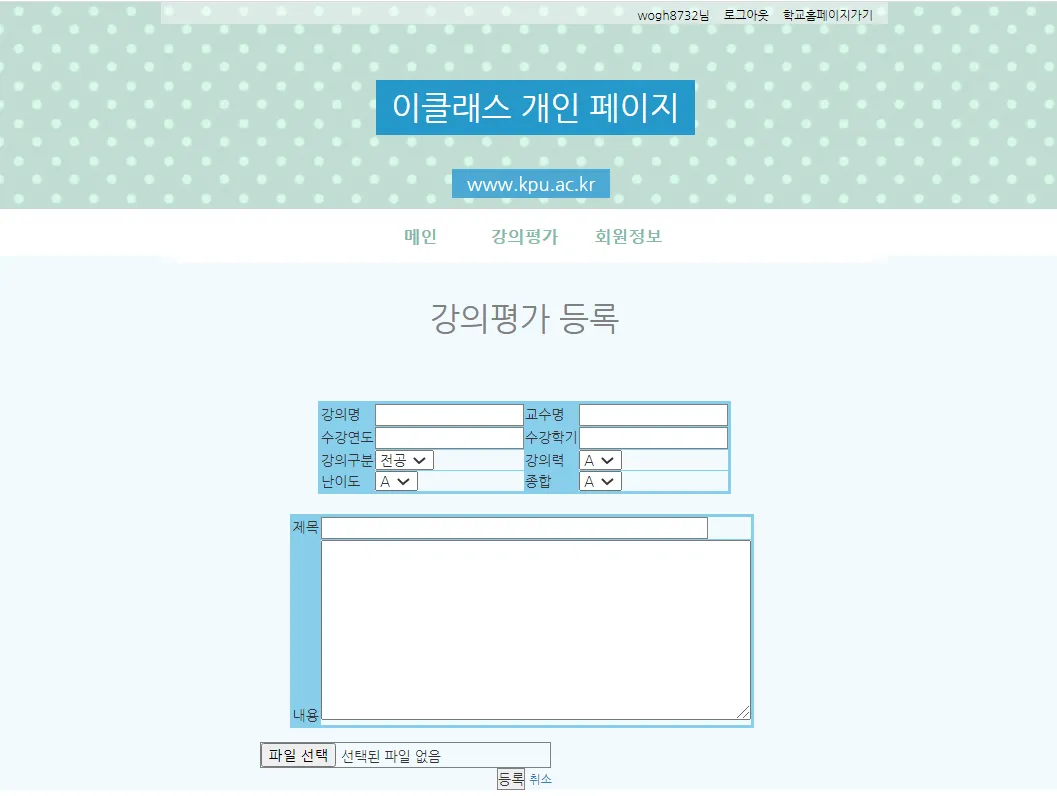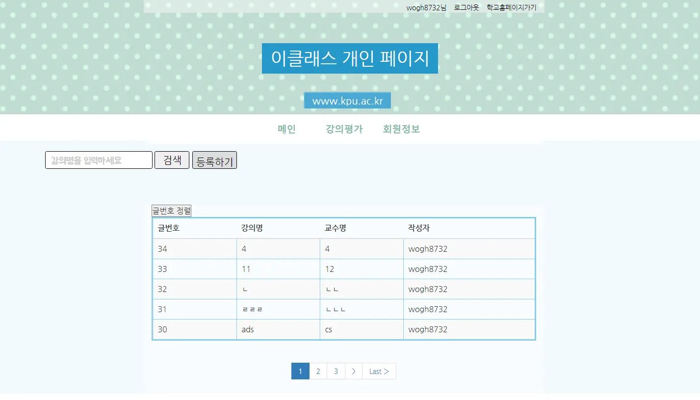 네비게이션 바에는 메인으로 돌아올수 있는 탭과, 강의평가탭, 마지막으로 회원정보를 확인할 수 있는 탭이 있다.