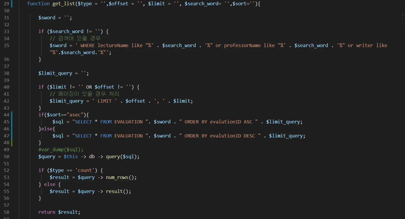 강의평가 메인페이지의 게시글을 리스트로 보여주기 위해 db와 통신하는 함수이다. 검색어가 있을 경우, like 조건을 추가하여 검색한 단어가 포함된 게시글을 다 조회하는 쿼리를 추가했다.
