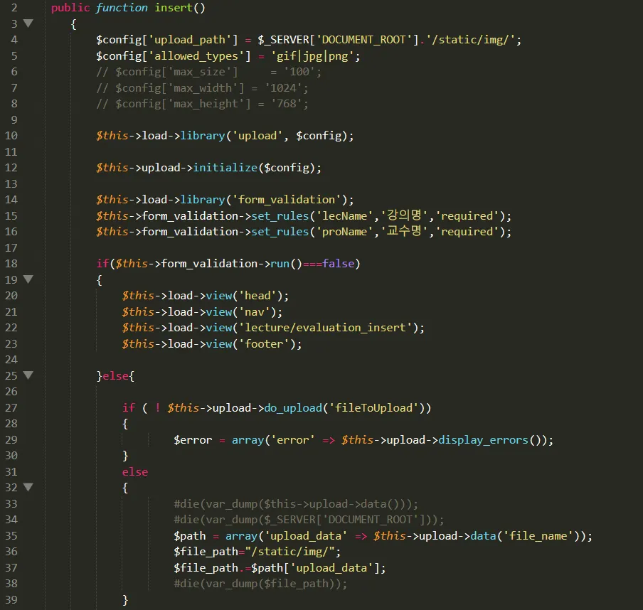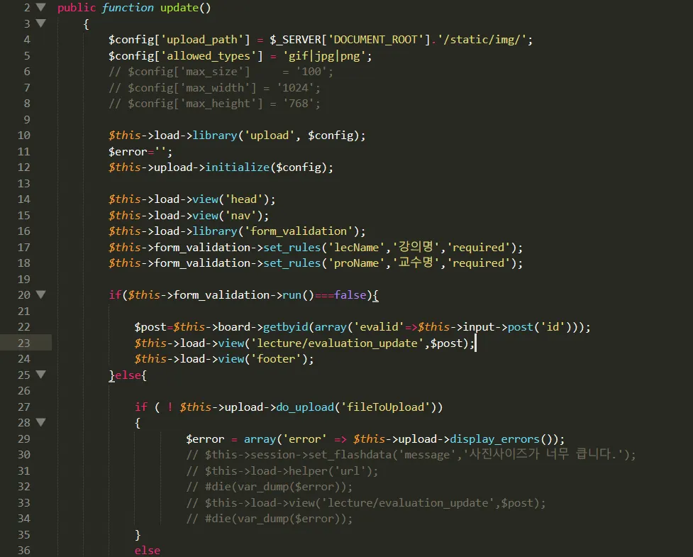 게시글을 등록하는 함수이다. $config에 파일업로드에 대한 설정 값을 등록하였다. 허용하는 확장자는 git, jpg, png 3개이고, 원래 사이즈에 대한 값도 세팅해놨는데 뭐가 에러떠서 그냥 없앴다.ㅋ