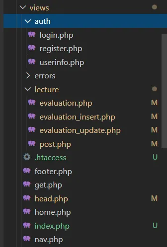 view는 아래에 하위폴더로 auth, lecture를 구성했다. 사용자 관련 페이지는 auth 폴더에 넣어놨고, lecture 폴더에는 강의평가 관련 페이지를 넣었다.