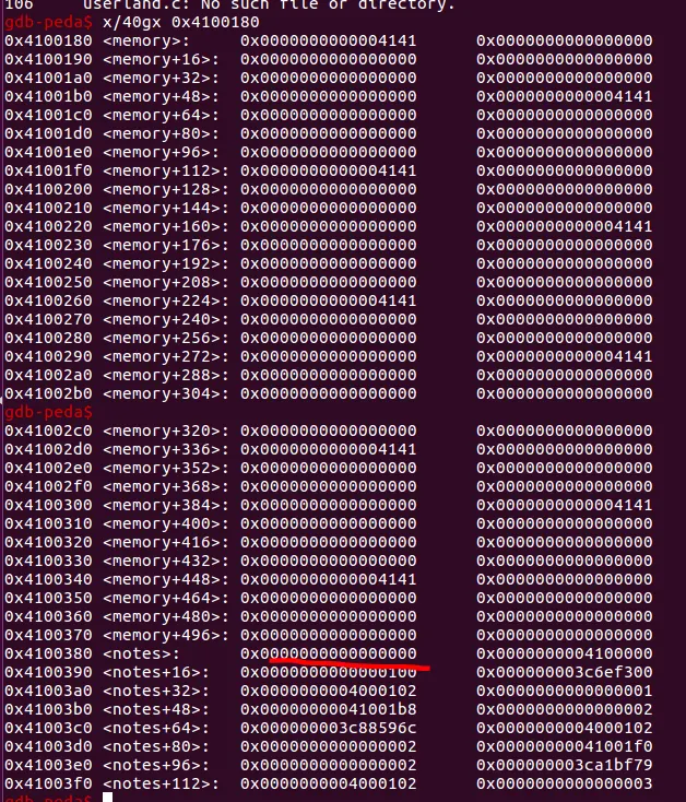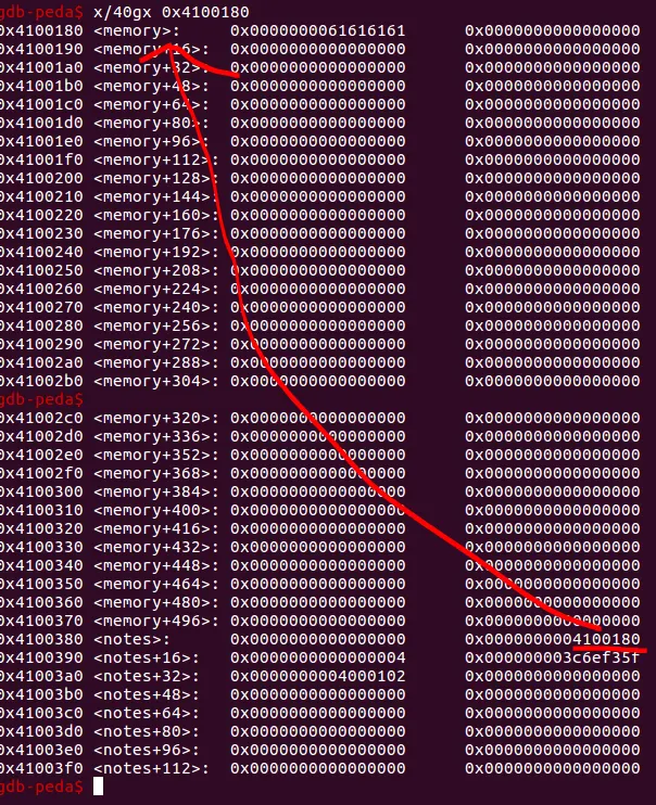 note→note 영역에 memory[memory_ptr]주소를 넣는다. ptr은 0부터 +0x38씩 증가가 된다. serial에는 뭔 값이 들어가는데, 의미하는건 뭔지 모르겠다. 어쨋든 여기서 취약점이 발생한다. memory 배열은 512바이트 크기인데 0x38 만큼 인덱스가 증가하므로, 만약 노트가 0 ~ 9까지 만들게 된다면,
