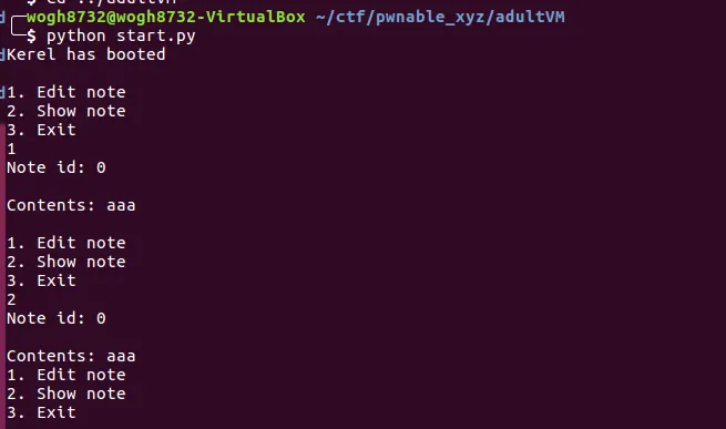 start.py를 실행시키면, 3개의 메뉴가 나온다. 1번으로 노트 id를 선택하여 내용을 넣을수 있다. 2번으로는 입력한 값을 확인 가능하다.