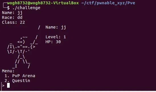 우선, pvp() 함수를 이용하여 레벨을 6이 되게 해준다. 그런다음 pve 함수를 실행시켜 play_quest 함수에서 1번 quest를 선택하여 s2에 어떠한 값을 입력한다. 그다음, 다시 pve 함수를 실행시켜,