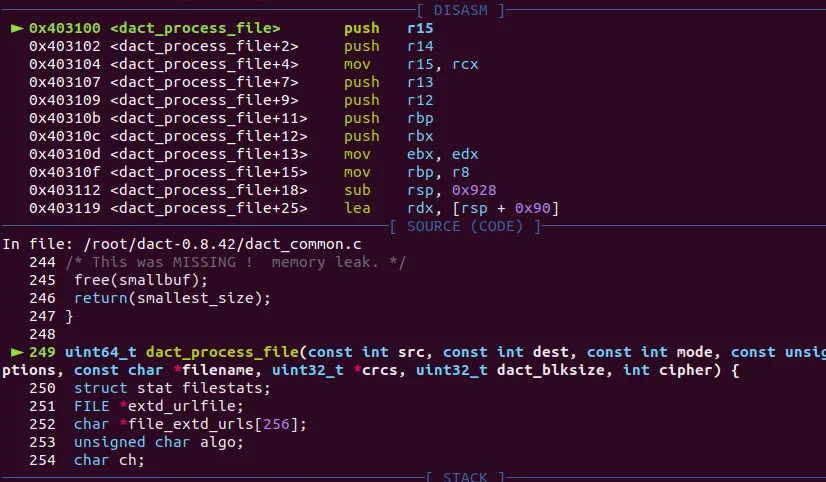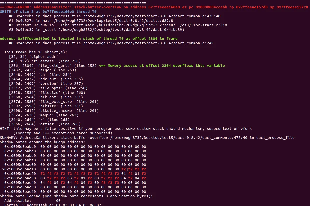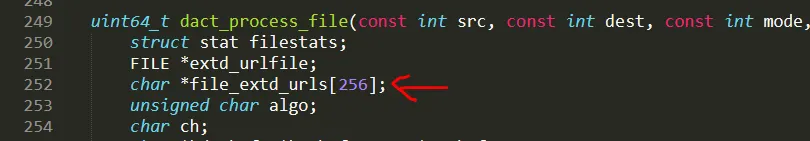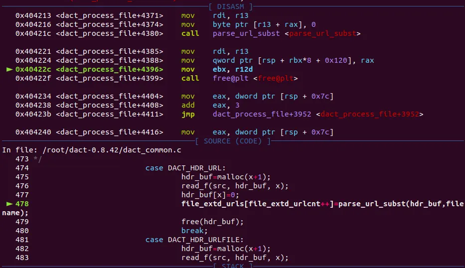 sig:11 을 위주로 보다보면, stack bof가 터지는걸 확인할 수 있다. dact_common.c:478 라인(dact_process_file 함수)에서 크래시가 터졌으며, 해당 바이너리에서 사용되는 오브젝트들이 보인다. 그 중 file_extd_urls에서 overflow가 났다고 표기가 되어있다. 소스코드가 존재하기 때문에 이제 해당 정보를 가지고 분석 및 익스 시나리오를 짜보자