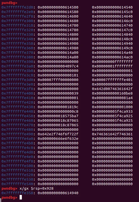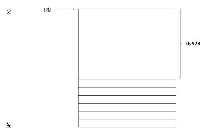 대충 요런 느낌이다. 그렇다면, 해당 함수가 ret되려면 sub로 0x928 만큼 뺀다음 pop 6번을 하고 그때의 스택의 rsp값을 가져와서 이전 함수로 돌아갈텐데, stack bof로 ret되는 위치를 덮으면 될것이다.