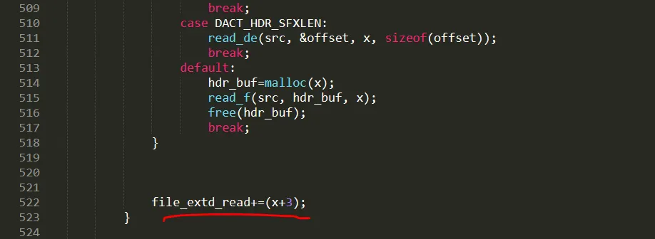 while문은 file_extd_read에서 x+3 만큼 반복된다. 즉 초기에 0부터 파일에서 읽은 x 사이즈 +3 만큼 증가되면서 file_extd_size 에서 뽑은 값과 비교한다.