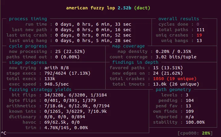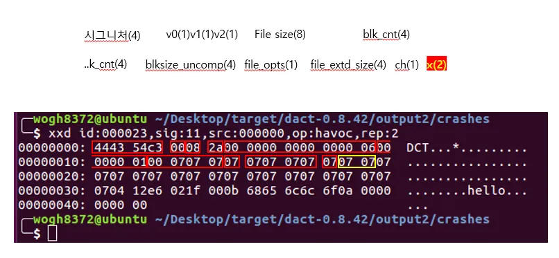 브팍 멘토님 수업때 퍼징 기초 예시로 dact 압축해제 프로그램을 대상으로 수업을 했었다. 환경은 멘토님이 제공해준 도커환경에서 진행하였고, afl로 돌린 크래시를 대상으로 진행을 하였다. 도커안에 들어있는 dact 바이너리는 일단, 모든 미티게이션이 꺼져있다. 퍼징 기초 수업이였기 때문에 경험과 공부목적으로 진행했다.