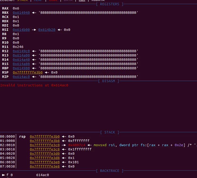 rsp+0x928에 oob write로 힙 주소가 들어가 있다. 해당 힙에는 파일에서 읽은 0x30 사이즈의 B가 들어가 있다. 여기서 쭉 진행을 하면