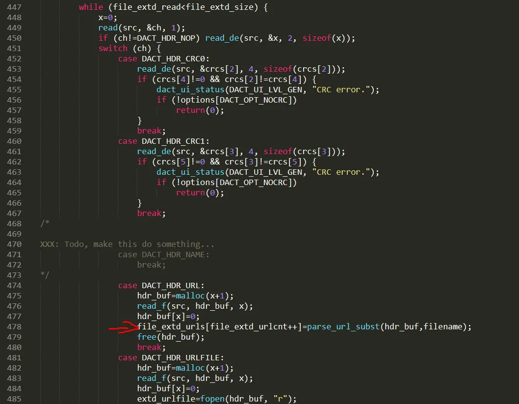 dact_common.c : 478 라인을 보면, 아까 표시되었던 file_extd_urls가 존재한다. 447 라인에서 while문을 돌게되고, case DACT_HDR_URL 안에서 file_extd_url 배열에 반복적으로 값을 넣는다.