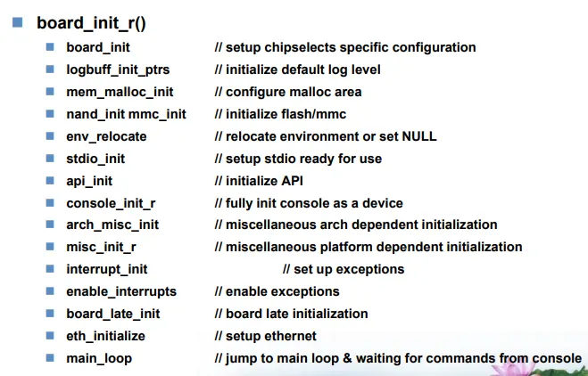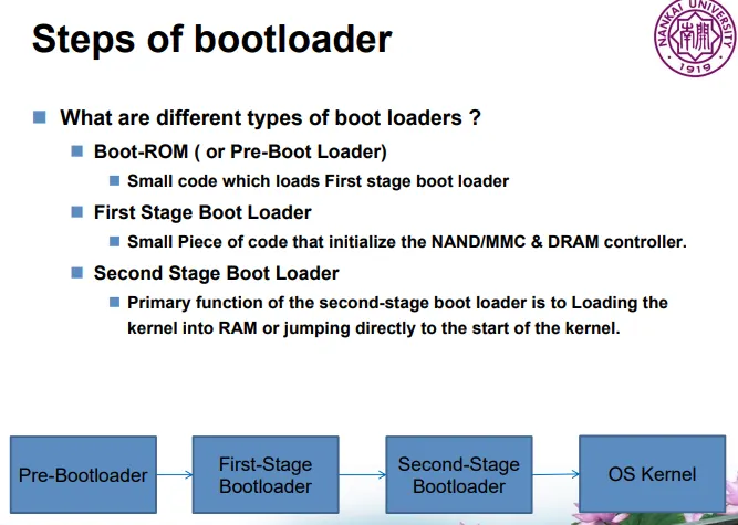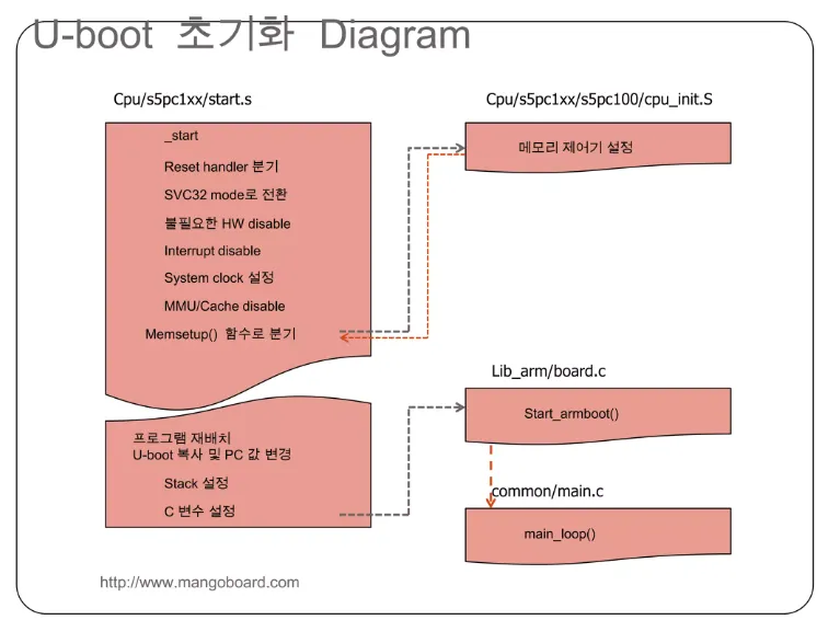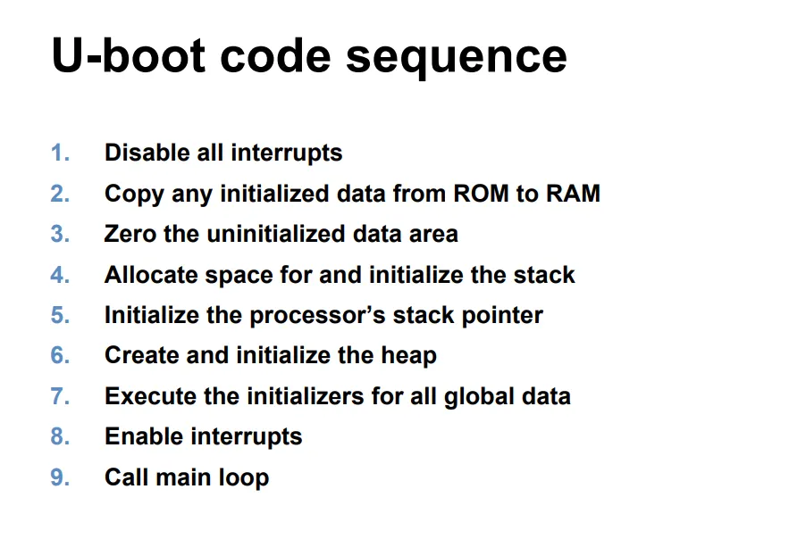 즉 임베디드 보드에 전원이 인가되었을 때, 메모리, 하드웨어(네트워크, 프로세서 속도, 인터럽트), 코드/데이터/스택 영역의 설정 및 초기화를 진행하며 커널을 메모리에 적재하여 커널을 실행시키는 역할을 한다.