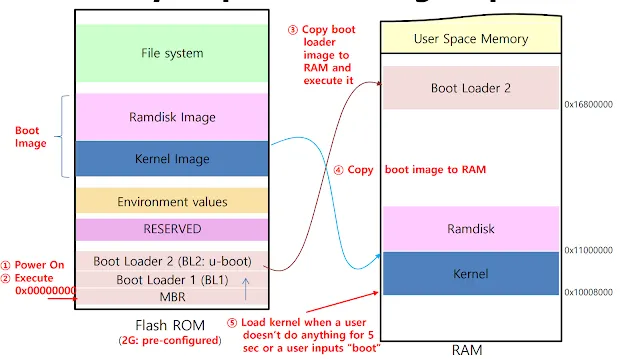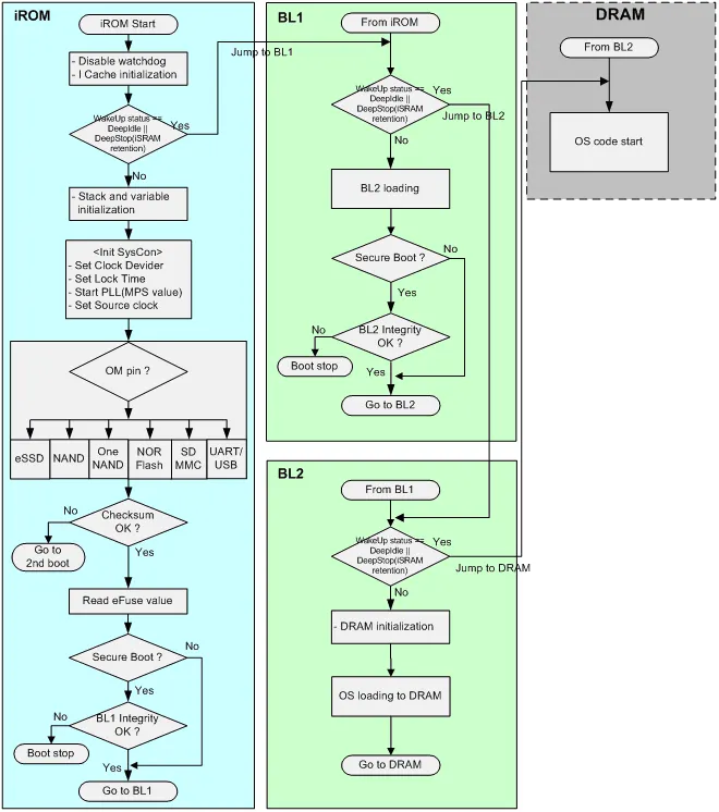 pre-bootloader가 bl0 단계로 ROM 코드가 실행되면 BL1인 First Stage Bootloader를 isram에 로드한다. First stage bootloader는 dram 컨트롤러 초기화 및 부팅 장치를 찾아 BL2 즉 second stage boot loader를 램에 올린다. 최종적으로 second stage boot loader에서 초기화 및 커널을 로딩한다.