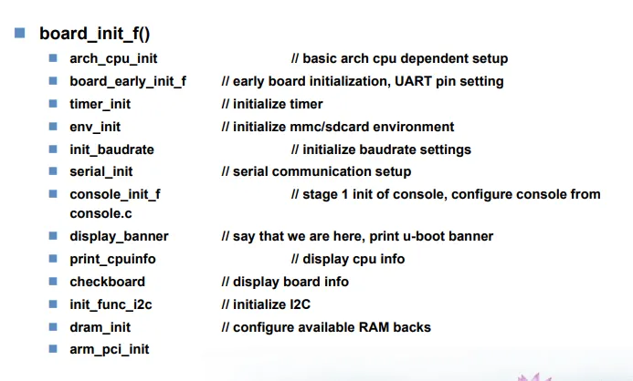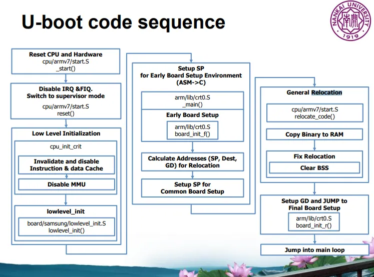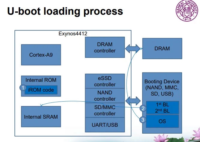 pre-loader가 dram을 초기화한 후 부트로더의 2단계 코드를 플래시(nand/emmc)에서 dram으로 로드하여 실행한다. 하드웨어 장치 초기화, 시스템 매모리 맵 확인 커널 매개변수 설정 등을 수행한다.