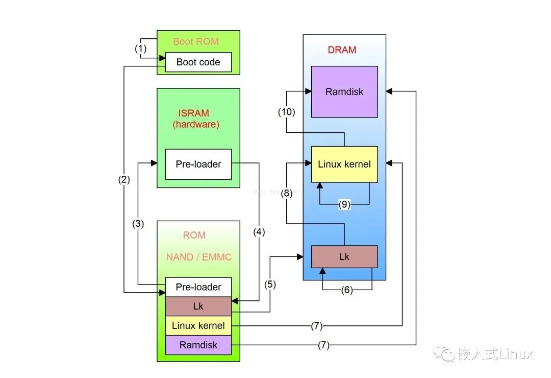 ARM CPU의 전원이 켜지면 PC 레지스터가 IC에 내장된 rom 시작 부분을 가리킨다. 이 rom을 BROM(boot rom)이라 하며 부팅 장치의 pre-loader를 찾아 isram에 로드한다.