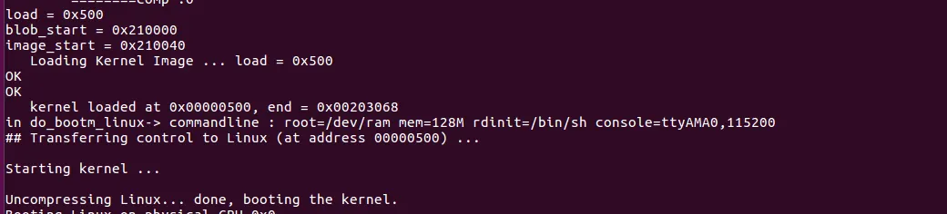 qemu의 uboot → kernel 부팅 로그를 확인해보면 설명한 것과 동일한 것을 알 수 있다.