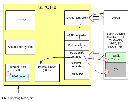 OM pin으로부터 부팅 매체를 찾아 BL1을 iRAM(SRAM)으로 읽어들인다. (OM pin은 OneNAND, NAND, MoviNAND, eSSD and iNAND와 같은 booting device를 결정한다)