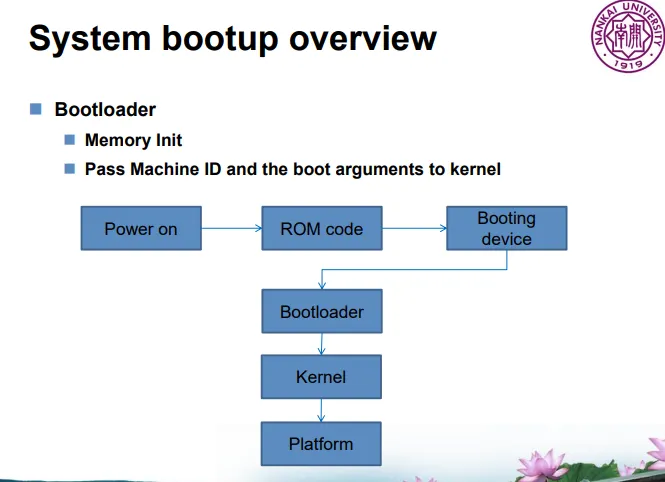 하드웨어 초기화 및 uboot 같은 우리가 아는 부트로더가 실행되며 최종적으로 커널이 메모리에서 부팅되며 제어권을 커널로 넘긴다.